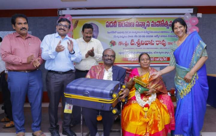 సింగరేణి సంస్థ లో సుమారు 35 సంవత్సరాల సుధీర్ఘ సర్వీసులో వివిధ గనులు మరియు డిపార్ట్మెంట్లలో పనిచేసి ప్రస్తుతం పర్సనల్ డిపార్ట్మెంట్ వెల్ఫేర్ వింగులో కమ్మ్యూనికేషన్ ఆఫీసర్ గా పనిచేస్తూ సోమవారం పదవీ విరమణ చేసిన సీనియర్ పర్సనల్ ఆఫీసర్ టి.శ్రీనివాస రావు ని జిఎం(పర్సనల్) ఐఆర్ అండ్ పిఎం కవితా నాయుడు, జిఎం(పర్సనల్) వెల్ఫేర్ అండ్ సిఎస్ఆర్ జి.వి.కిరణ్ కుమార్ మరియు వెల్ఫేర్, ఏఈపిఏటిబి సెల్, ఆర్సి, ఐఆర్ అండ్ పిఎం, ఈఈ సెల్, ఈఆర్పి, కమ్మ్యూనికేషన్, స్పొర్ట్స్, సిపిఆర్ఎంఎస్ విభాగాల డిజిఎం(పర్సనల్) లు, డివై.పిఎం లు, సీనియర్ పిఓ లు మరియు ఇతర అధికారులు మరియు పర్సనల్ డిపార్ట్మెంట్ల సిబ్బంది సింగరేణి ప్రధాన కార్యాలయ కాన్ఫరెన్స్ హాల్లో సోమవారం పూల మాలలతో, శాలువాలతో జ్ఞాపికలతో ఘనంగా సన్మానించారు.
