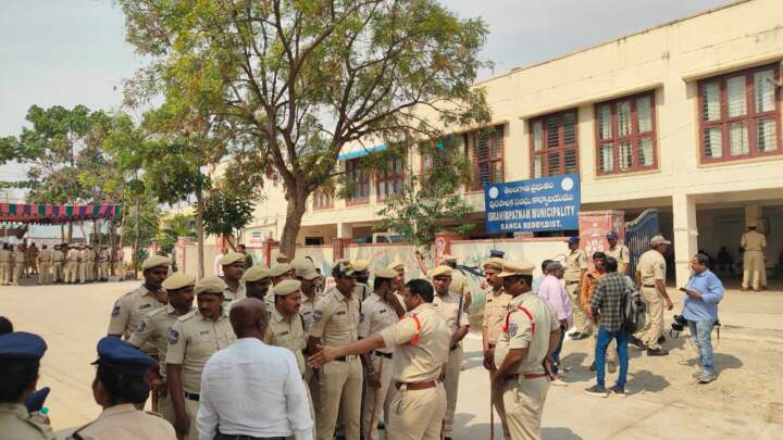 ఇబ్రహీంపట్నం మున్సిపల్ చైర్మన్ వైస్ చైర్మన్ ఎన్నికల్లో భాగంగా గతంలో జరిగిన పరిణామాల దృష్ట్యా ఈరోజు శనివారం పోలీస్ బందోబస్తు భారీగా మున్సిపల్ కార్యాలయం వద్దకు మోహరించడం జరిగింది. చైర్మన్ ఎన్నిక సమయంలోఎలాంటి అవాంఛనీయ ఘటనలు జరగకుండా చైర్మన్ వైస్ చైర్మన్ ఎన్నిక సజావుగా జరిగే విధంగా చర్యలు తీసుకోనున్నట్లు ఎన్నికల అధికారి వెల్లడించడం జరిగింది.
