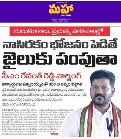 గురుకులాలు, ప్రభుత్వ పాఠశాలల్లో.. నాసిరకం భోజనం పెడితే జైలుకు పంపుతా..-: సీఎం రేవంత్ రెడ్డి వార్నింగ్..