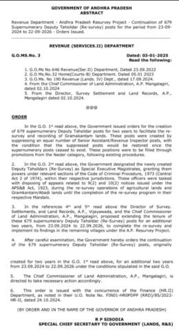 ఏపి రీసర్వే ప్రాజెక్టు కింద 679 సూపర్ న్యుమరరీ డిప్యూటీ తహసీల్దార్లను మరో రెండేళ్లు కొనసాగింపు