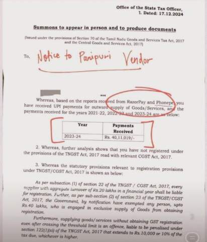 ఏడాదికి రూ.40 లక్షలు సంపాదిస్తున్నాడని.. పన్ను నోటీసులు జారీ ఫోన్పే, రేజర్పే రికార్డుల ఆధారంగా.. ఆ వ్యాపారీకి నోటీసులు నిబంధనల ప్రకారం.. ఏడాదికి 20 లక్షల టర్నోవర్ కలిగిన వ్యాపారికి జీఎస్టీ నమోదు తప్పనిసరి