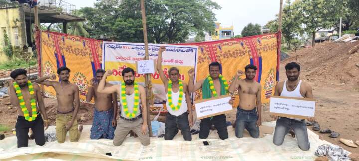 దమ్మపేట ,జూలై 3 మహా : బస్టాండ్ లో పెట్రోలు బంక్ నిర్మాణ పనులను నిలిపివేయాలని నిరసిస్తూ బస్టాండ్ సాధన కార్యాచరణ కమిటీ యువకులు గురువారం అర్ధనగ్నంగా నిరసన తెలిపారు.మండల కేంద్రంలో బస్టాండ్ లేక