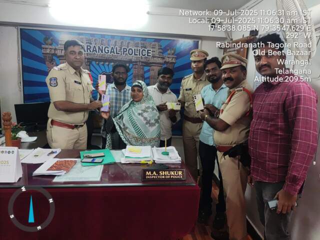 వరంగల్ మహా; వరంగల్ నగరంలోని ఇంతే జార్గంజ్ పోలీస్ స్టేషన్ పరిధిలో సెల్ ఫోన్లను పోగోట్టుకున్న ఐదుగురు వ్యక్తుల యొక్క ఖరీదైన సెల్ ఫోన్లను ఇన్స్పెక్టర్ యంఏ షుకూర్ బుధవారం వారికి అప్పగించారు. ఈ