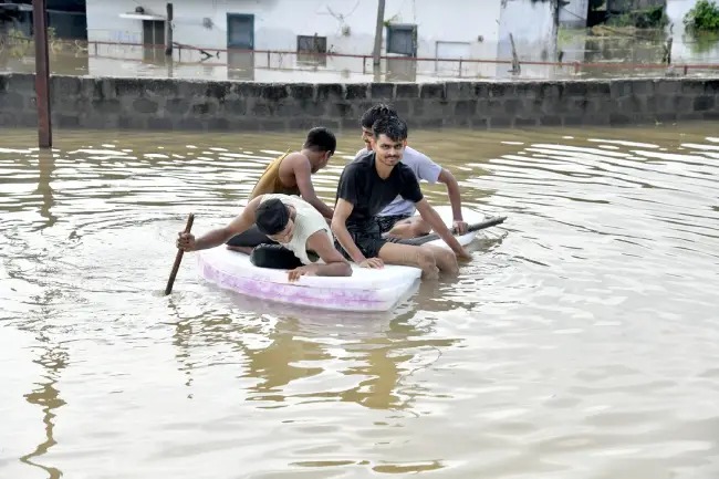 వరదల్లో వరంగల్ మొంథా తుఫాన్ ప్రభావంతో అల్లకల్లోలం జలమయమైన వరంగల్, హన్మకొండ, కాజీపేట మునిగిన జవహర్ కాలనీ, గోపాల్ పూర్, హండ్రెడ్ ఫీట్ రోడ్డు ముంపు ప్రాంతాల ప్రజలను పడవల సహయంతో తరలిస్తున్న ఎస్డీఆర్ఎఫ్